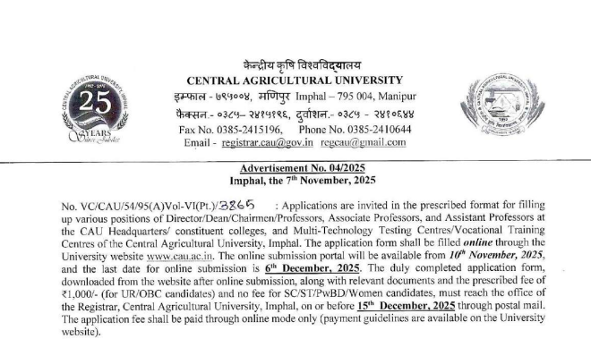 CAU Bharti 2025: केंद्रीय कृषि विश्वविद्यालय की तरफ से प्रोफेसर, डीन, डायरेक्टर और अन्य पदों के लिए एक नई भर्ती का नोटिफिकेशन जारी हो चुका है। इच्छुक और योग्य उम्मीदवार 6 दिसंबर 2025 तक अपना ऑनलाइन आवेदन फॉर्म भर सकते हैं। अगर आप भी शिक्षा क्षेत्र में अपना प्रतिष्ठित करियर बनाना चाहते हैं तो आपके लिए एक शानदार मौका आ चुका है, जहां केंद्रीय कृषि विश्वविद्यालय की तरफ से 179 रिक्त पदों को भरे जाने की कवायद शुरू हो चुकी है। विश्वविद्यालय की तरफ से प्रोफेसर, डायरेक्टर, डीन, अध्यक्ष, एसोसिएट प्रोफेसर, असिस्टेंट प्रोफेसर सहित विभिन्न पदों पर आधिकारिक नोटिफिकेशन जारी किया गया है। इच्छुक और योग्य उम्मीदवार 6 दिसंबर 2025 तक अपना ऑनलाइन आवेदन फॉर्म भर सकते हैं। आवेदन फॉर्म भरने की सभी प्रक्रिया विश्वविद्यालय की आधिकारिक वेबसाइट के माध्यम से ही पूरी की जाएगी।
