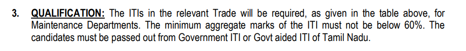 इस भर्ती के लिए आवेदन करने वाले उम्मीदवारों के पास 10वीं या 12वीं पास के साथ संबंधित टेक्नीशियन ट्रेड में न्यूनतम 60% अंकों के साथ आईटीआई डिप्लोमा होना जरूरी है।
