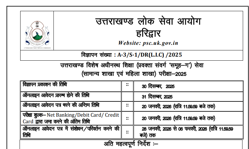 Lecturer Recruitment 2026: अगर आप भी लेक्चरर भर्ती का इंतजार कर रहे थे तो आपके लिए उत्तराखंड पब्लिक सर्विस कमीशन की तरफ से एक नया नोटिफिकेशन जारी हो चुका है, जिसके तहत 808 पदों पर पोस्ट ग्रेजुएशन से संबंधित लेक्चरर की भर्ती निकाली गई है। इस भर्ती के लिए आवेदन फॉर्म भरने की प्रक्रिया 31 दिसंबर 2025 से शुरू हो चुकी है, जिसकी अंतिम तिथि 20 जनवरी 2026 निर्धारित की गई है।