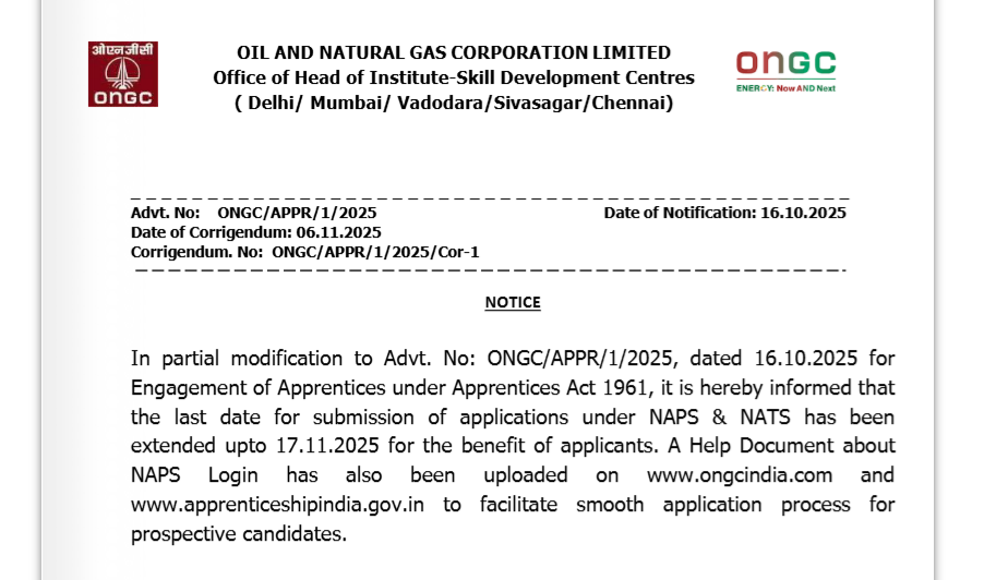 ONGC Apprentice Recruitment 2025 से जुड़ी महत्वपूर्ण अपडेट