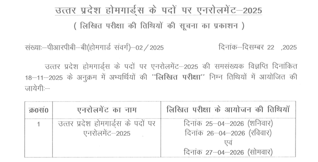 UP Home Guard Bharti Exam Date Out: उत्तर प्रदेश पुलिस भर्ती एवं प्रोन्नति बोर्ड की तरफ से 40,424 पदों के लिए परीक्षा कार्यक्रम सोमवार को घोषित कर दिया गया। आपकी परीक्षा आगामी वर्ष 2026 में 25, 26 और 27 अप्रैल को आयोजित की जाएगी। इस संबंध में आधिकारिक वेबसाइट uppbp.gov.in पर जाकर पूरी जानकारी ली जा सकती है।