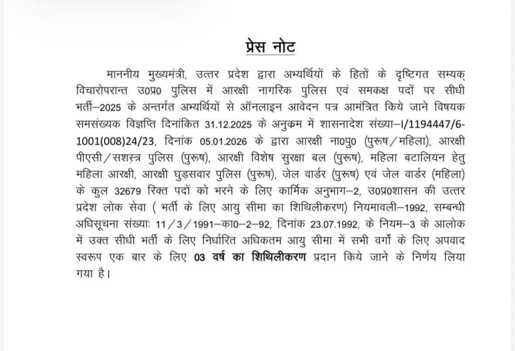 डिस्क्लेमर:- इस सूचना का उद्देश्य केवल अभ्यर्थियों को सामान्य जानकारी प्रदान करना है। भर्ती प्रक्रिया से संबंधित अंतिम और आधिकारिक विवरण यूपी सरकार या उत्तर प्रदेश पुलिस भर्ती एवं प्रोन्नति बोर्ड (UPPRPB) द्वारा जारी अधिसूचना/प्रेस नोट में ही मान्य होंगे। उम्मीदवारों को सलाह दी जाती है कि वे आवेदन करने से पहले आधिकारिक वेबसाइट पर उपलब्ध दिशा-निर्देशों और नोटिफिकेशन को ध्यानपूर्वक पढ़ें। किसी भी प्रकार की त्रुटि, परिवर्तन या अद्यतन के लिए सरकार/भर्ती बोर्ड ही जिम्मेदार होगा।